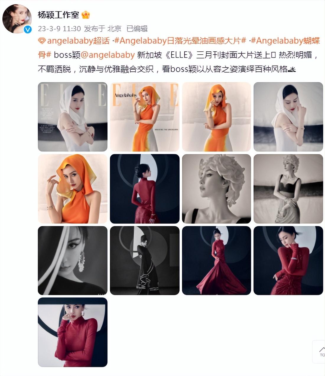 3月9日,杨颖(Baby)工作室分享了一组boss为某时尚杂志拍摄的封面大片。这次Baby连换数套造型出镜,每一帧都美得不可方物,惊艳众人。据悉,Baby这次登上的是新加坡《ELLE》三月刊封面,时尚资源超级好。