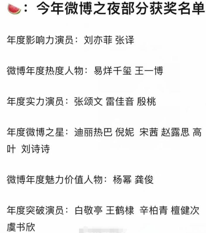除此之外,网上目前也曝光了部分盛典的获奖名单,比如年度影响力演员是刘亦菲跟张译,微博年度热度人物是王一博跟易烊千玺,年度实力演员有张颂文,雷佳音,殷桃,年度魅力价值人物有杨幂跟龚俊,年度微博之星有热巴,倪妮,宋茜,赵露思,高叶,刘诗诗,年度突破演员有白敬亭,王鹤棣,王柏青,檀健次,虞书欣!