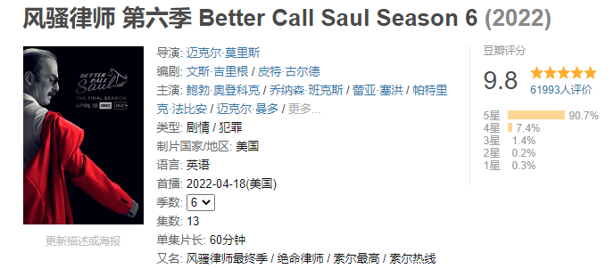 《风骚律师》第六季也是该系列的最终季,是一部犯罪剧情美剧,这部剧的尺度较大,口碑较高,可以说算是天花板之作。说句夸张的话,可能爱看美剧的朋友,没有没看过这部的。而且风骚律师也是绝命毒师的前传。