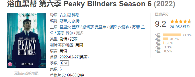 《浴血黑帮》第六季于2022年2月上映,一共6集,单集时长60-80分钟,相当于电影版的电视剧了,还是比较长的,这部剧主要讲述了战后伯明翰地区传奇黑帮家族剃刀党的故事。