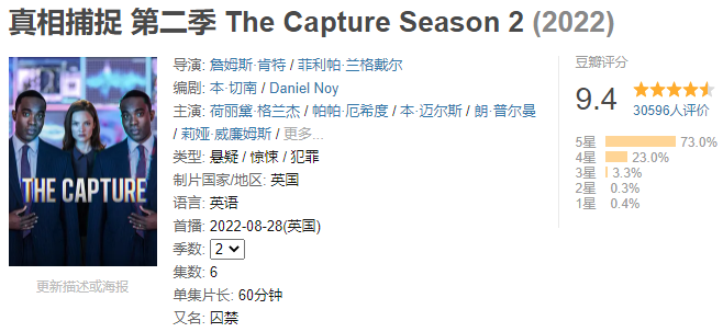 《真相捕捉》第二季是本·切南执导的悬疑惊悚犯罪英剧,于2022年8月上映,一共6集,单集60分钟。继续延续首季的故事,瑞秋·凯莉继续深入调查真相,凯莉更深入地陷入令人眼花缭乱的虚假信息世界,她只是初步了解了这个阴谋。