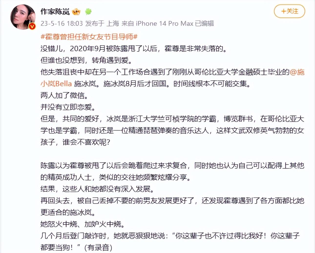 根据陈露的说法,她和霍尊分手的时间,是在2020年9月。
