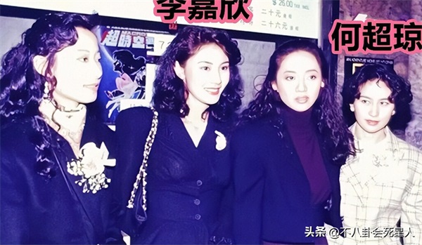 可惜何超琼年轻时和李嘉欣几乎没有正儿八经的合照,唯一一张大合照,但两人都不是正面看镜头的。这张四人合照中,站在中间的李嘉欣确实美艳,甚至可以说是艳压众人,何超琼吃亏在身材比较娇小,那个时候也比较稚嫩。