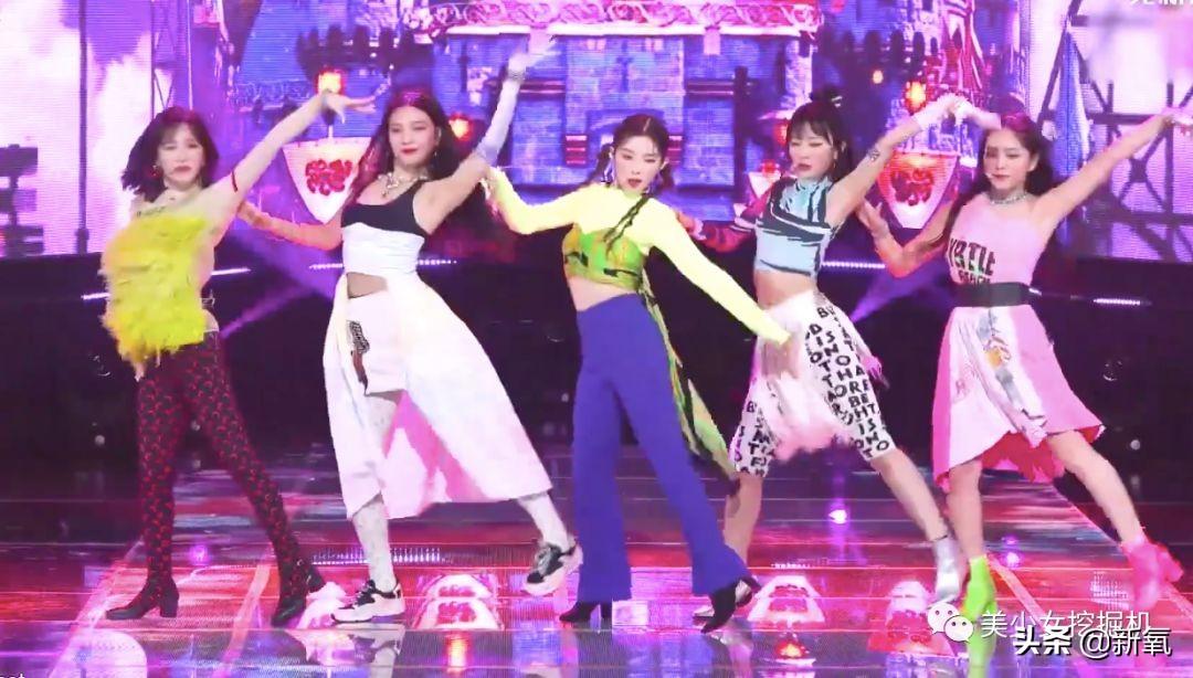 从左往右,wendy的草皮上衣是用包包改造的,joy是下身为了个围裙,irene荧光绿上衣搭配紫色喇叭裤,涩琪的包臀字母短裤,yeri的骚粉裙搭配荧光混色皮靴…烤地瓜真的不是在整她们?