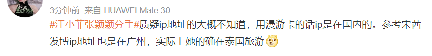 不过有敏锐的网友表示,虽然张颖颖否认自己和汪小菲约会,声称自己在泰国,但是IP地址却显示在广东。对此有网友科普,称如果是用的漫游卡就会先是在国内。