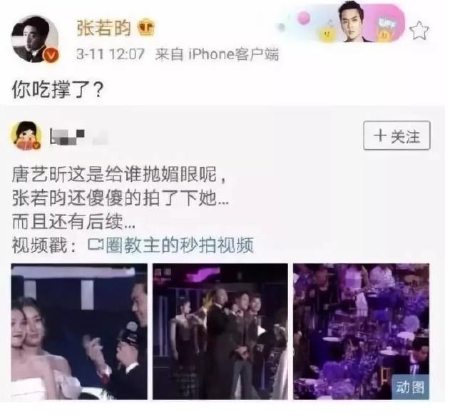 另一张动图里,原本张若昀很亲昵的在唐艺昕耳边讲话,结果镜头就捕捉到唐艺昕看向了后桌的吴秀波,当时,吴也对唐挥手打了招呼。这个镜头就又被该名大V博主硬说成两人关系不简单。