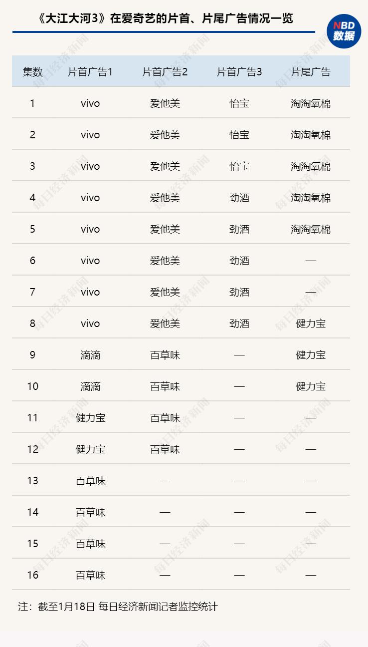 这引发了网友的关注与讨论。截至 1 月 18 日,正午阳光、爱奇艺等出品的《大江大河 3》播放了 18 集,《每日经济新闻》记者逐集观看发现:该剧在爱奇艺播出时,片首和片尾的广告中先后出现过 8 个品牌,分别为 vivo、爱他美、怡宝、劲酒、淘淘氧棉、健力宝、滴滴、百草味;片尾和片首广告最多时为 4 个,自 13 集开始,仅剩百草味一个。到 1 月 18 日晚播出的《大江大河 3》17 集、18 集,爱奇艺的片首片尾广告均为零。