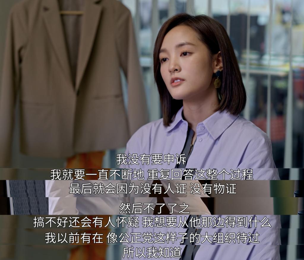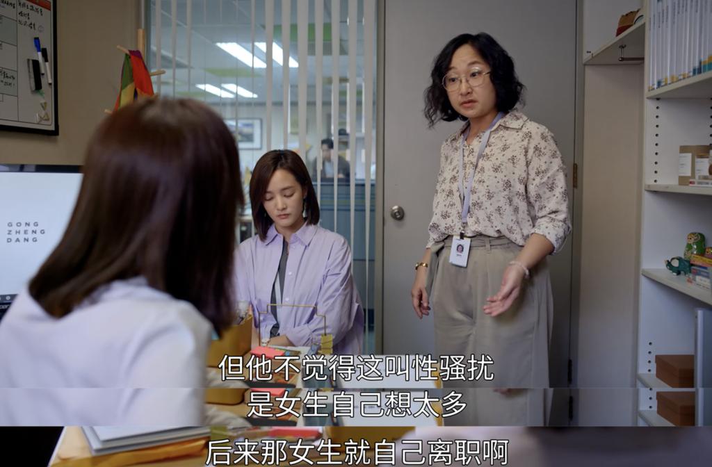 谢盈萱饰演的女上司翁文方听到雅静被性骚扰之后,她选择相信而不是立马质疑真实性,并关心她的情绪状态:" 你现在还好吗?"