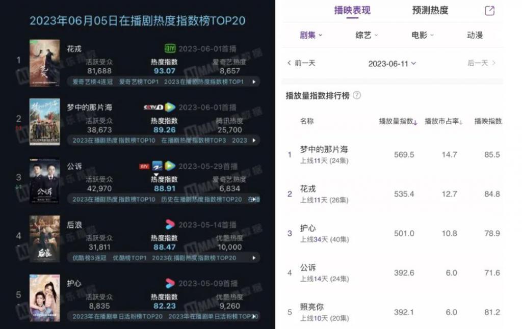 从目前的播映数据来看,《花戎》的成绩也相对可圈可点:时至 6 月 5 日,其艾漫的在播热剧热度指数位列全平台第一,艺恩的播放指数排行位列全平台第二。