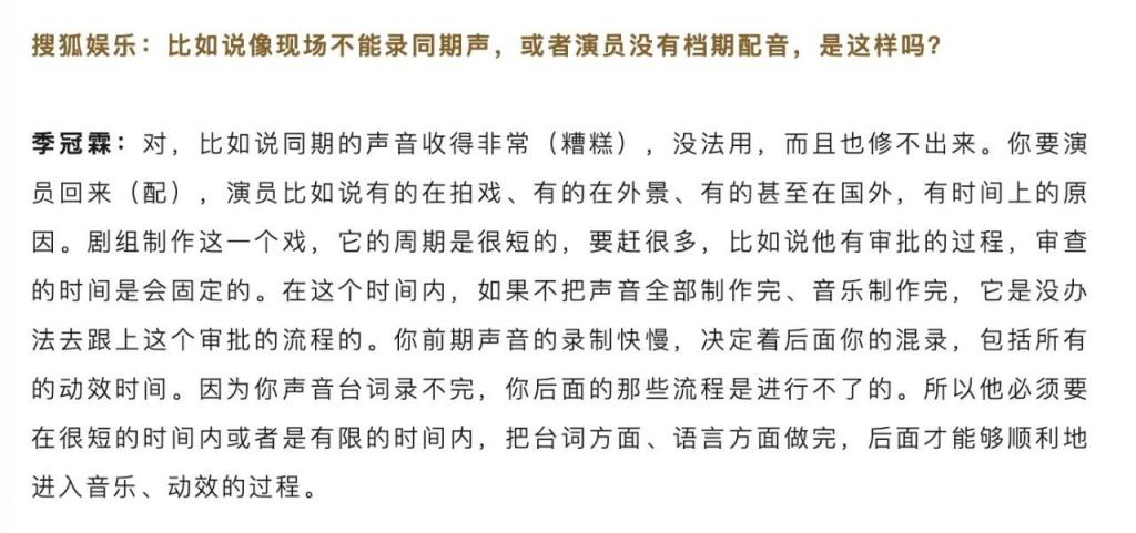 季冠霖就曾在一次采访中透露了大量影视剧配音的原因:“有的在拍戏、有的在外景、有的甚至在国外 ...... 剧组制作一个戏的周期是很短的。”