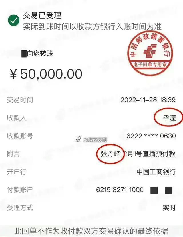 无独有偶,另一位直播商家贴出了张丹峰直播钱直接转账到毕莹账户的截图。账单显示,2022年11月28日,张丹峰的直播佣金5万元已于12月1日提前转入毕莹账户。随后,该商家向狗仔队发送了一张截图,并透露该商家当时已经为张丹峰和毕颖在杭州预订了一家希尔顿酒店。不幸的是,两人并不感激,于是出去预订了一间酒店套房,但后来要求商家报销。就说张丹峰和毕颖有这么大的丑闻,正常人都免不了怀疑。为什么两个人还在一起?中国只有一个代理商毕莹吗?没有毕莹,张丹峰就不能继续他的职业生涯吗?你把你的妻子洪欣安置在哪里?可以说出去住,让一个单身男人和一个寡妇住在套房里吗?