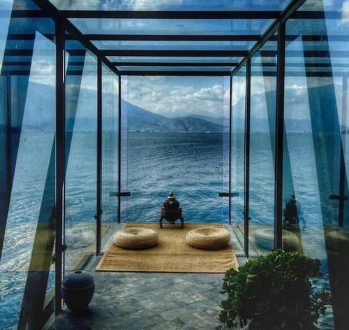 一边通往湖心的通道,阳光房的设计,四面通透,铺上一张凉席,一张坐垫,每天在这里打坐。一边冥想,一边欣赏户外的美景,宛如人间仙境。面朝大海,春暖花开。这么好的“月亮宫”却被强拆,实在令人惋惜呀,真是替杨丽萍打抱不平。谁不惹,偏偏惹上了鲁豫。