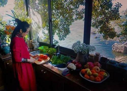 厨房选用开放式的设计,一边做菜一边欣赏户外的美景,这可以说是独一无二的厨房了。杨丽萍连切菜的姿势都这么优雅,感觉要仙女下凡了,真是美若天仙呀。杨丽萍为了保持完美的身材,为了身材不变样。平时她懂得养生,常年以素食,果蔬类的食物为主。