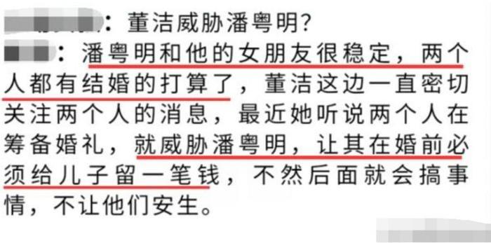董洁这边一直密切关注两个人的消息,最近她听说两个人在筹备婚礼,就威胁潘粤明。让其(潘粤明)在婚前必须给儿子留一笔钱,不然后面就会搞事情,不让他们安生。