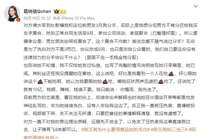 9 月 19 日下午,葛晓倩在社交平台晒出与张雨绮前夫袁巴元的聊天记录,表示对方请水军散播两人早在 3 月就分手的消息,但实际确实葛晓倩想分手但袁巴元不肯,甚至还买车送给女方求复合。之后二人一直共同生活到 9 月,葛晓倩才发现袁巴元居然已经跟张雨绮在一起。