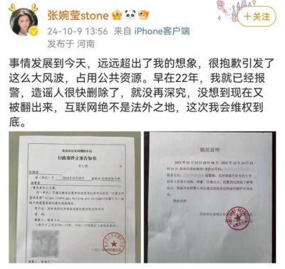 10月9日中午,張婉瑩在社交媒體上公開回應:“早在2022年,我就已經報警,造謠人很快刪除了,就没再深究,沒想到現在又被翻出來,互聯網絕不是法外之地,這次我会維權到底。”