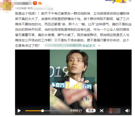 晒出该视频的网友表示:“就是这个视频!!前天下午有记者朋友一群访完陈坤,立马微信告诉我吐槽陈坤架子真的太大了,说难听点就是把骄横当个性。做个群访特别不耐烦,喊了三次媒体不要挡他的光,而且还都是“诶,那个人” “嘁,让开”这种语气,真的不是粉丝洗白的那种开玩笑,当时在现场就是特别的没有礼貌,作为一个公众人物对媒体毫无尊重可言,真的太傲慢,脾气太差了。既然接受群访,那说明这就是艺人与媒体在公开场合的工作啊!又不是私下场合偷拍,更不是强行要求你采访,这个态度有点过了吧?”