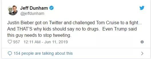 喜剧演员杰夫·杜汉姆也提出了自己的推断。“贾斯汀·比伯在推特上挑战汤姆·克鲁斯打架……这就是为什么孩子们应该对毒品说不。”就连特不朗普也表示,这家伙需要停止推特。”