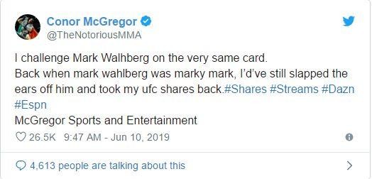 麦格雷戈并没有就此打住。事实上,他也提出了自己的挑战,挑战演员马克·沃尔伯格(Mark Wahlberg)。“我以同样的方式挑战马克·沃尔伯格。当马克·沃尔伯格还是马克·马克的时候,我还会扇他耳光,把我的ufc股票拿回来。”他写道。