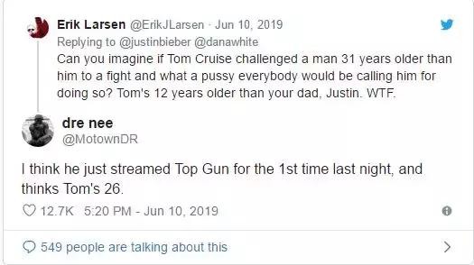 这条推特立即引起了很多人围观,很多人想知道为什么这位年轻的流行歌手会想和克鲁斯正面交锋,克鲁斯是一位经验丰富的动作明星,以表演自己的特技而闻名。