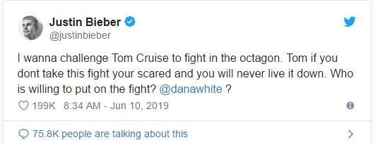贾斯汀·比伯在推特上向演员汤姆·克鲁斯发起了看似无缘无故的挑战。25岁的比伯在推特上说,他想在UFC八角形赛场上与56岁的克鲁斯对决。我想挑战汤姆·克鲁斯在八边形里战斗。汤姆,如果你不接受这场战斗,你就会感到害怕,你将永远没脸活下去。谁还愿意去战斗?他写道。