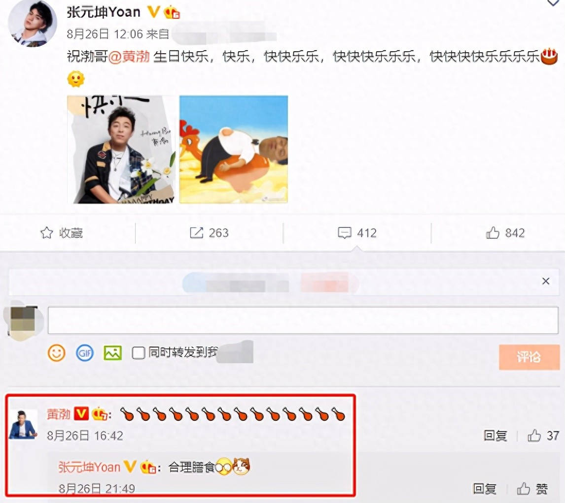 2025年8月,张元坤祝黄渤生日快乐,黄渤回复他鸡腿表情,两人还在互动。