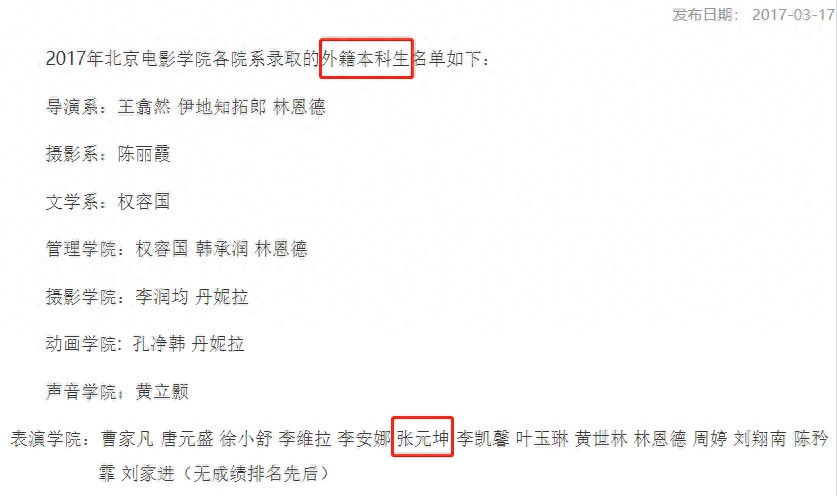 值得一提的是,北电官网公布的录取学生名单里,张元坤是外籍学生,他的名字旁边就是新加坡籍的李凯馨,这说明张元坤的国籍也不是中国。