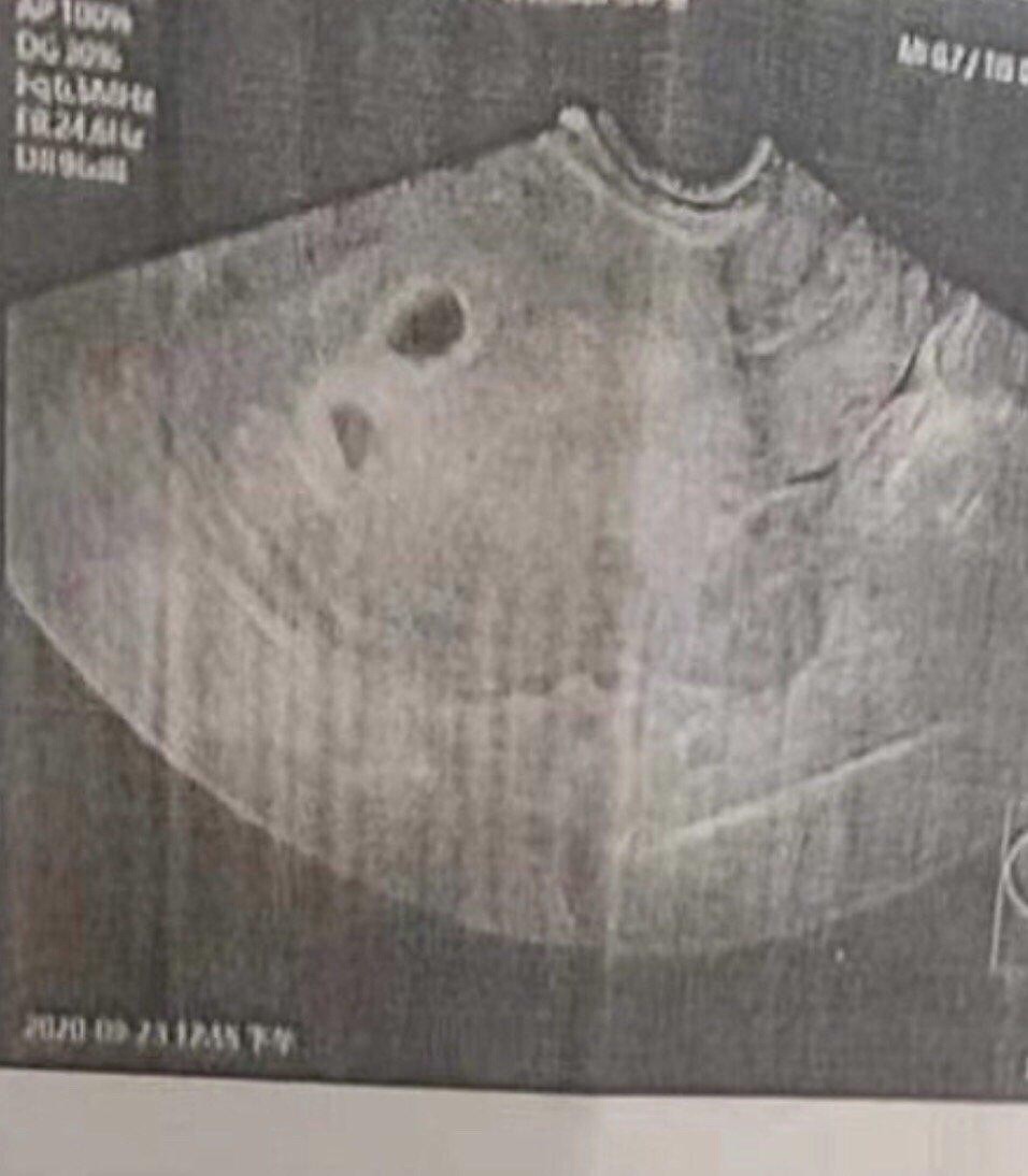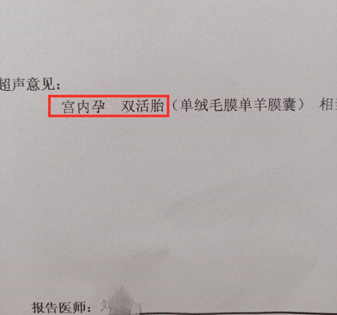 医生在超声波检测结果处写着“宫内孕,双活胎”,意思是她的肚子里有一对双胞胎。