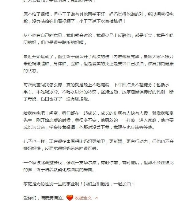 她15日在微博上发文分享近况,并感慨地称谢谢老公当初没有丢下自己,两人才有了今天幸福的生活。