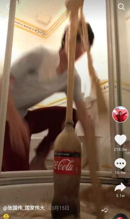 这是因为张国伟经常在自己的抖音号上表演龙吸水,具体的方法是用大瓶的可乐,加上薄荷糖,让可乐呈现出喷发状,然后张国伟还会用嘴来直接喝,经常弄的满脸都是可乐,非常搞笑。