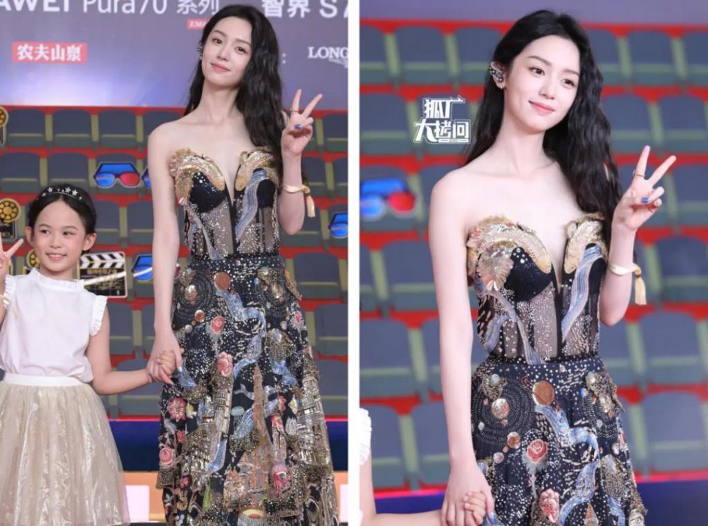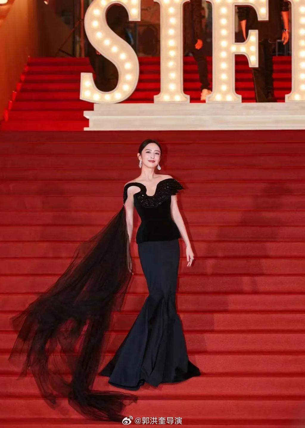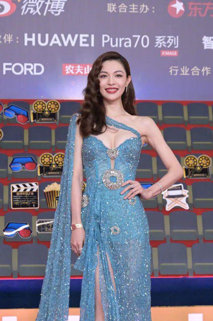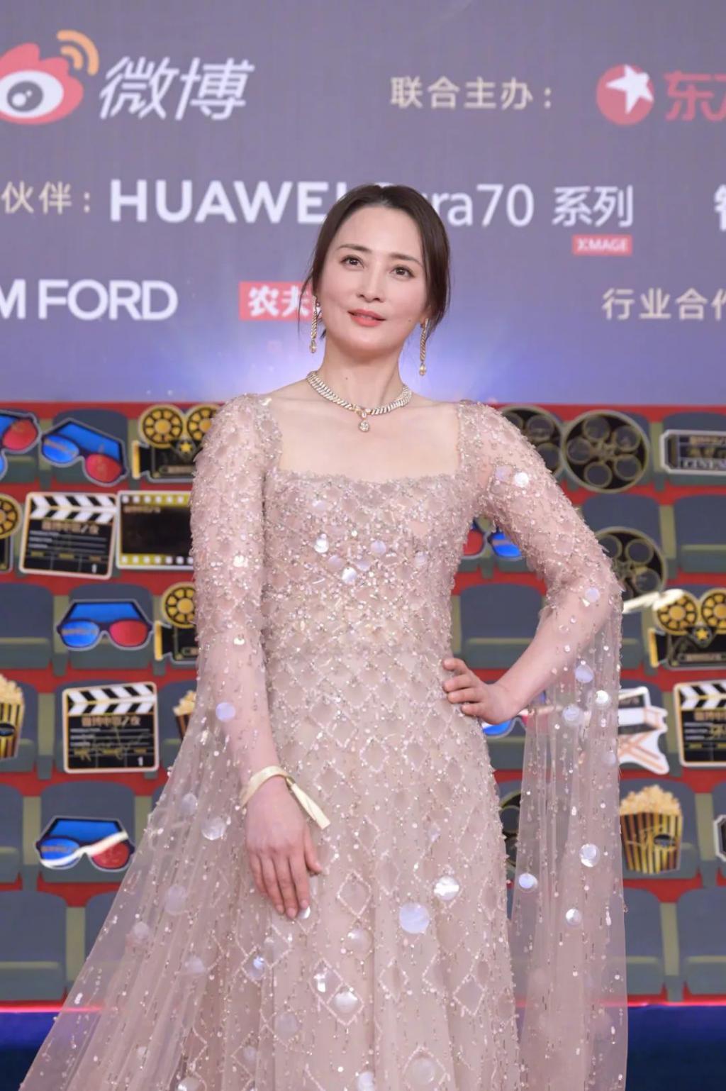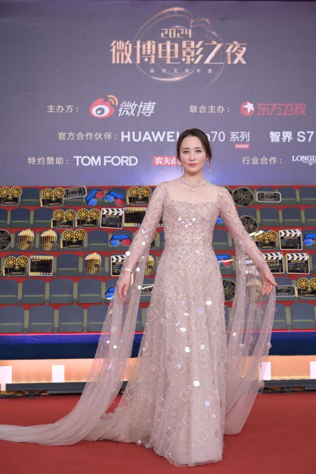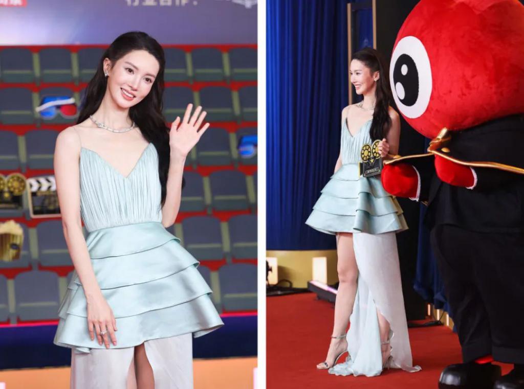 脱下上影红毯的高领后,她在微博电影之夜红毯选择了一身花苞鱼尾裙。