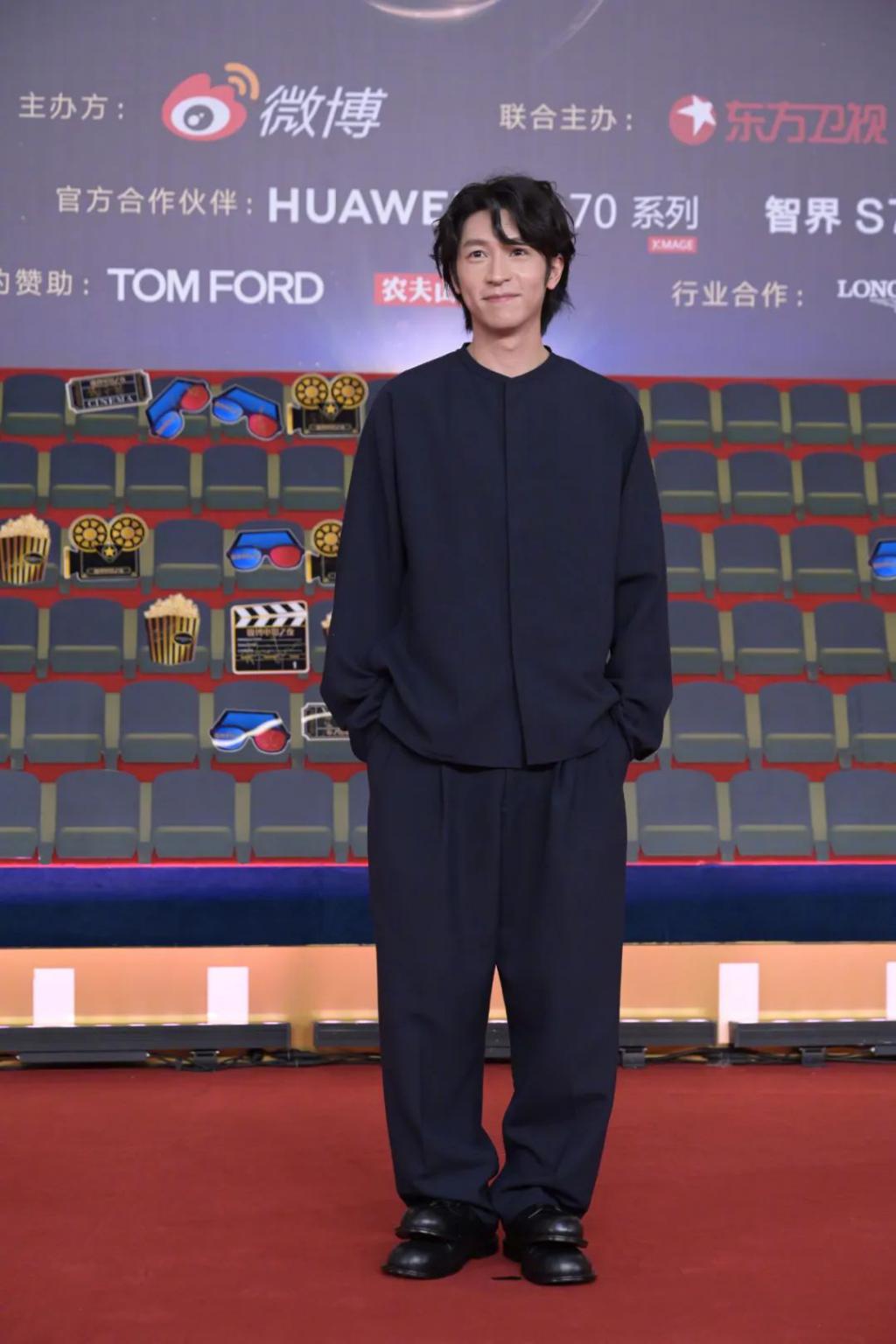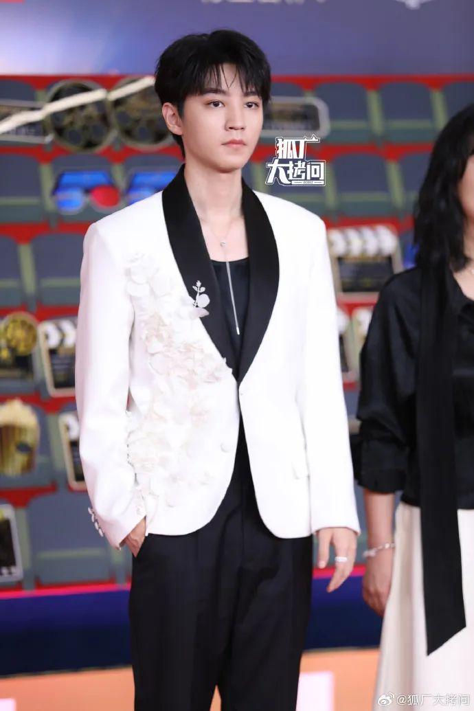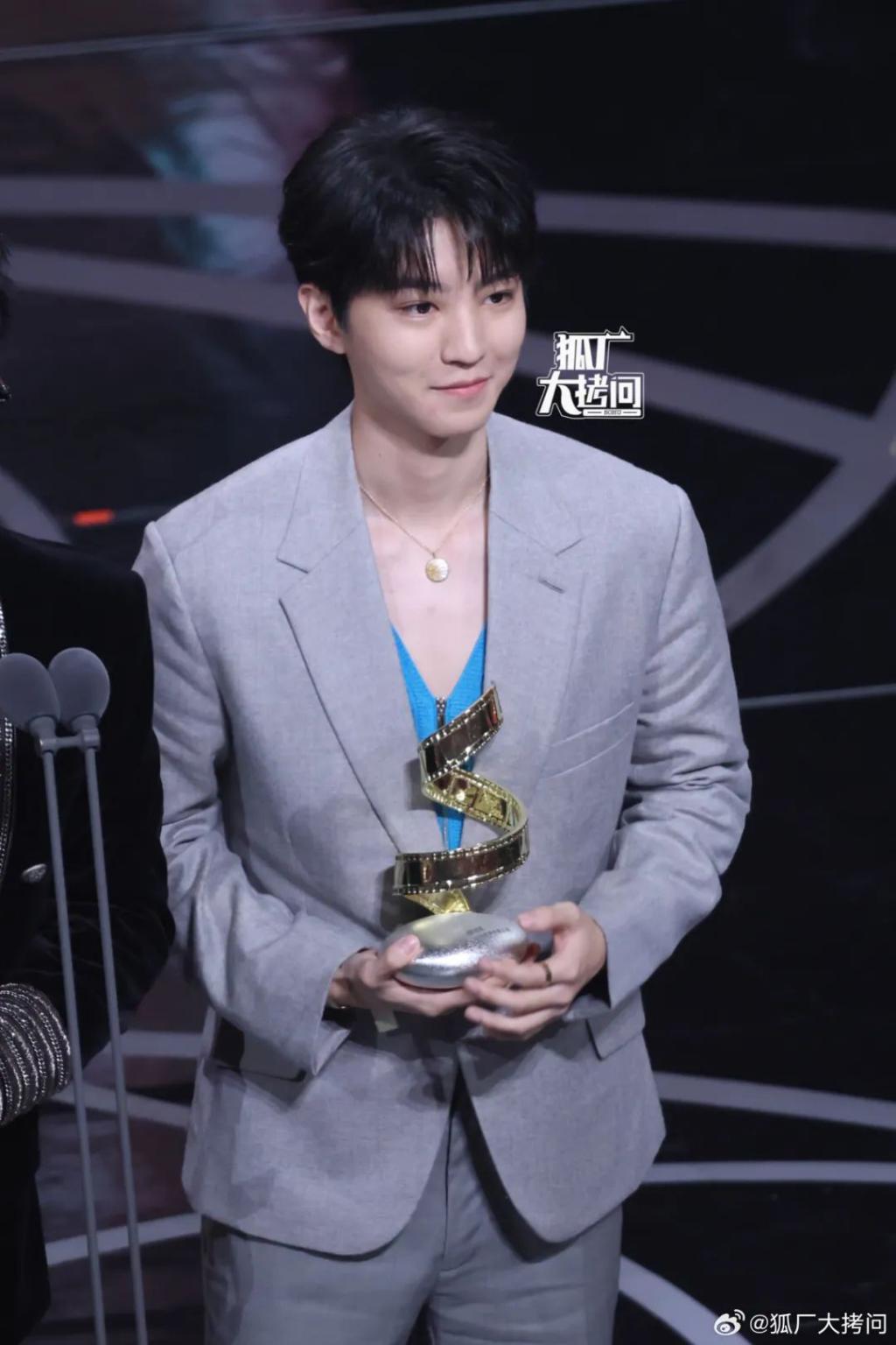 一进内场像被针对了,质朴的灰色西装配明丽的蓝色低领内搭,造型师到底是想他看起来成熟点还是浪一点?