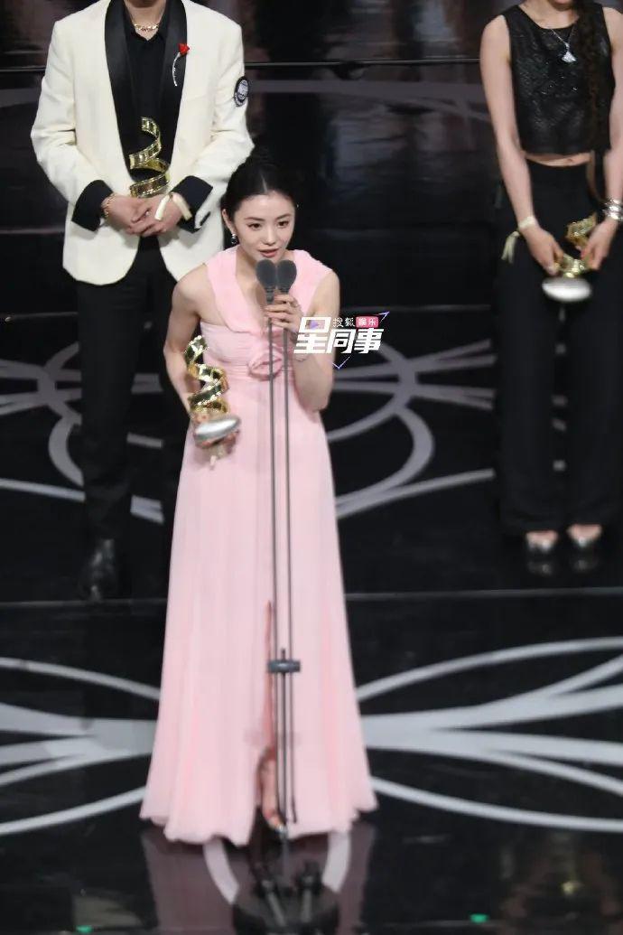 同样是粉色,内场这套淡淡的玫瑰粉,真的比红毯的死亡荧光粉好看多了。