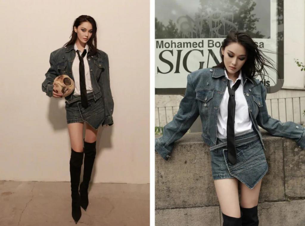 虽然还是浮夸的烟熏、湿发,但搭配牛仔套装的女校霸感明显要更适合她大气飒爽的气质。