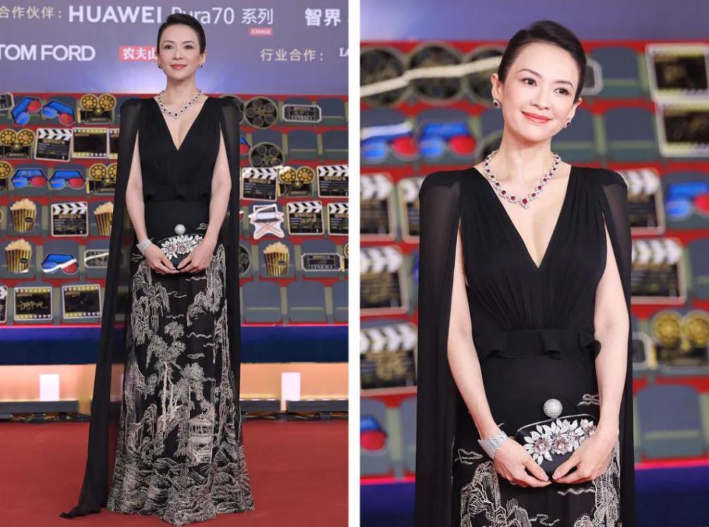 山水刺绣礼服真的好又古典韵味,身上的红宝石链、刺绣手拿包也和礼服很配。