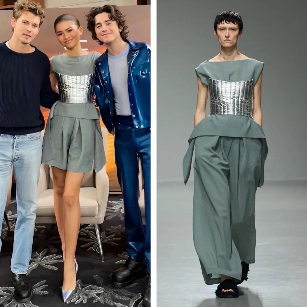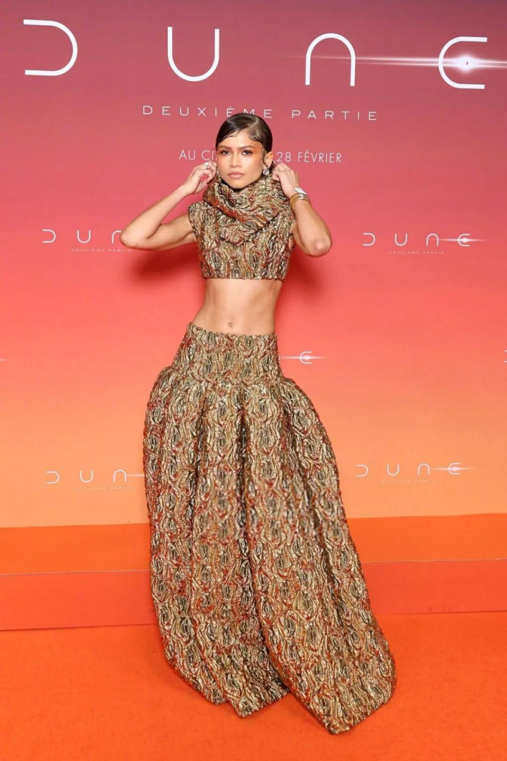 Zendaya不仅敢穿,还总能呼应到《沙丘2》的风格。比如这条LV定制露胃长裙,就有浓浓的末世废土feel。