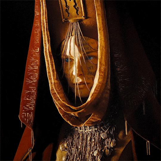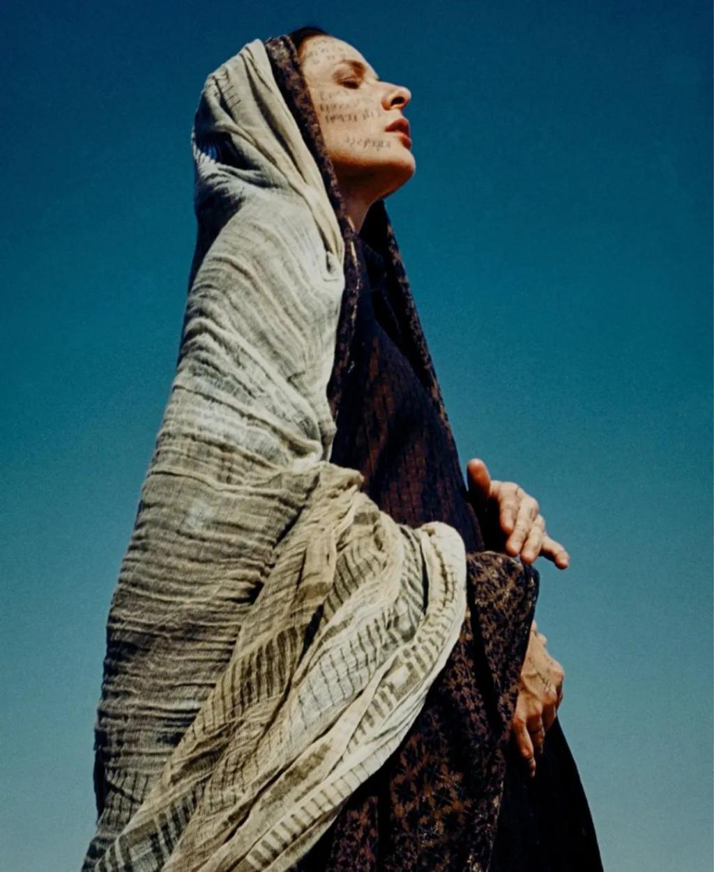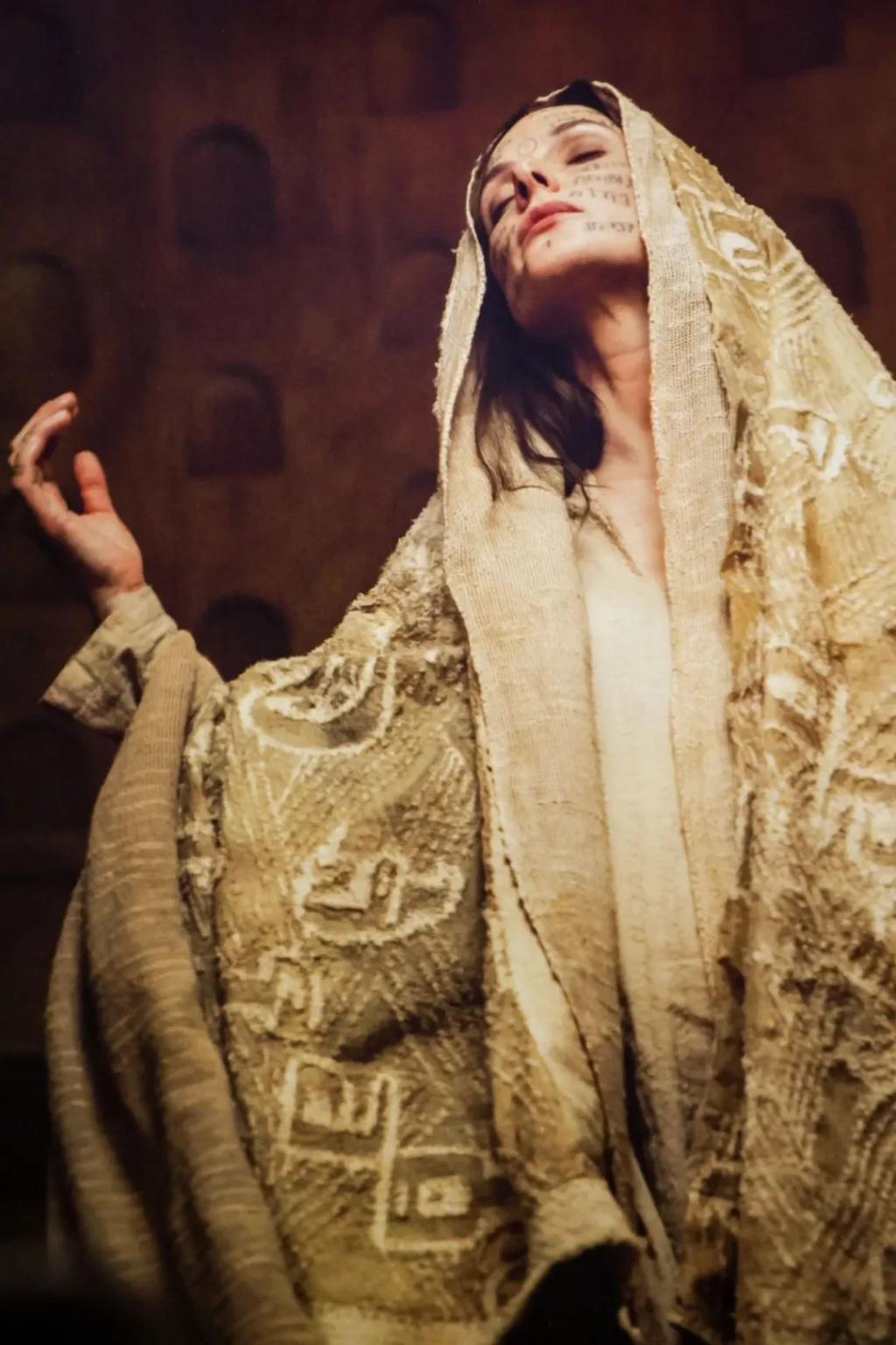 Jessica夫人成为南方圣母后,脸上印满了铭文预言,灵感来自有千年历史的埃及石棺人像。