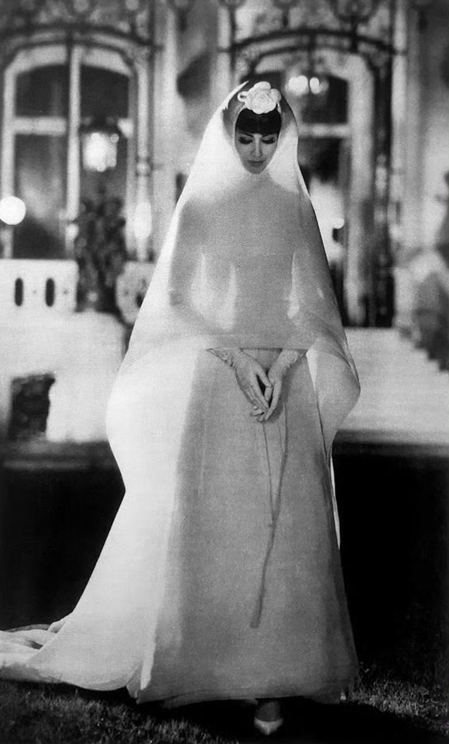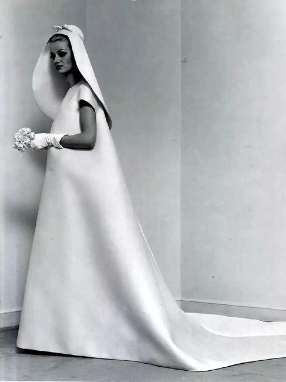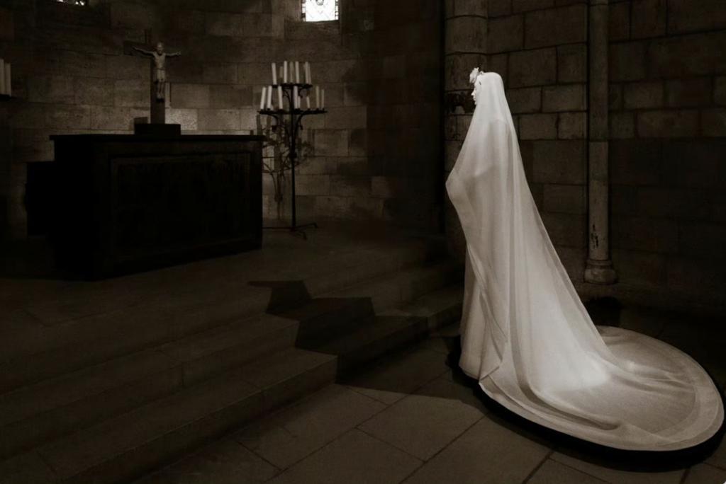 纯白的礼裙,设计源自Dior 1961 春夏高定系列,跨越足足半个世纪的作品。造型既像中世纪修女的着装,又像新娘的婚纱,神圣不可侵犯。