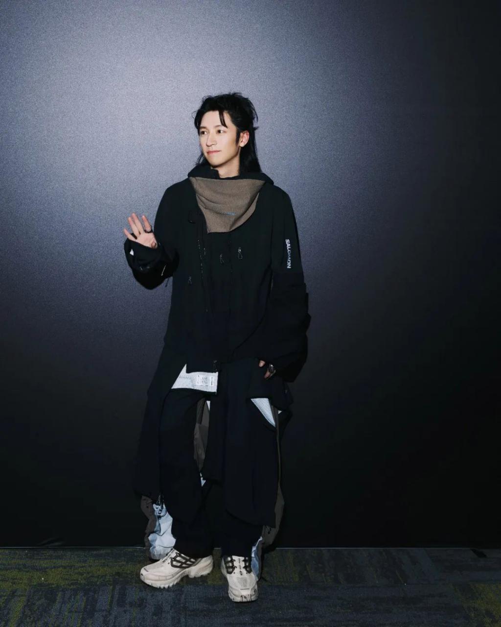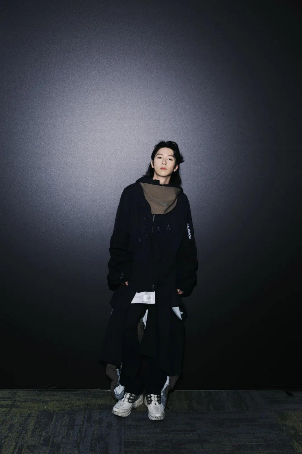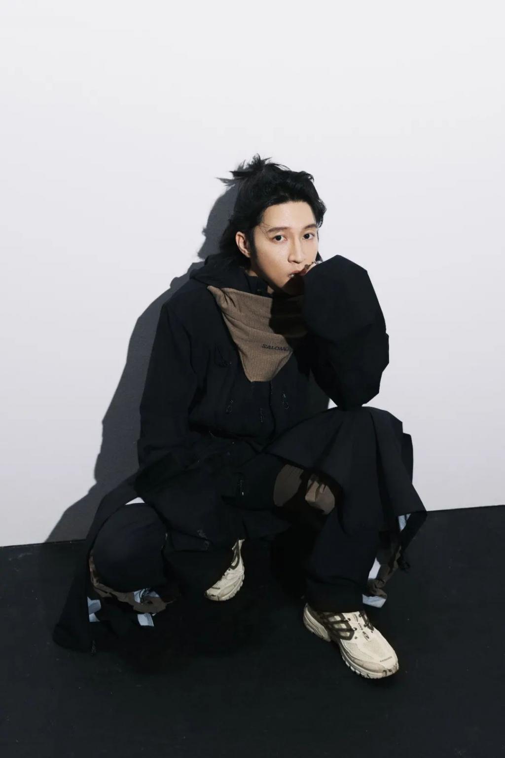 高阶一点,也可以玩反差,他这次就故意选了一双浅色系鞋子来搭配All Black末日废土风造型,有了对比,让整个穿搭造型跳脱出来。