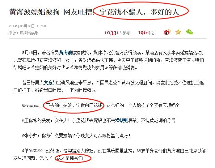 网上到现在都有很多人为黄海波洗白,说他是一时痛快,被人下套,说他其实放着身边的如云美女不潜,却宁愿花钱解决。