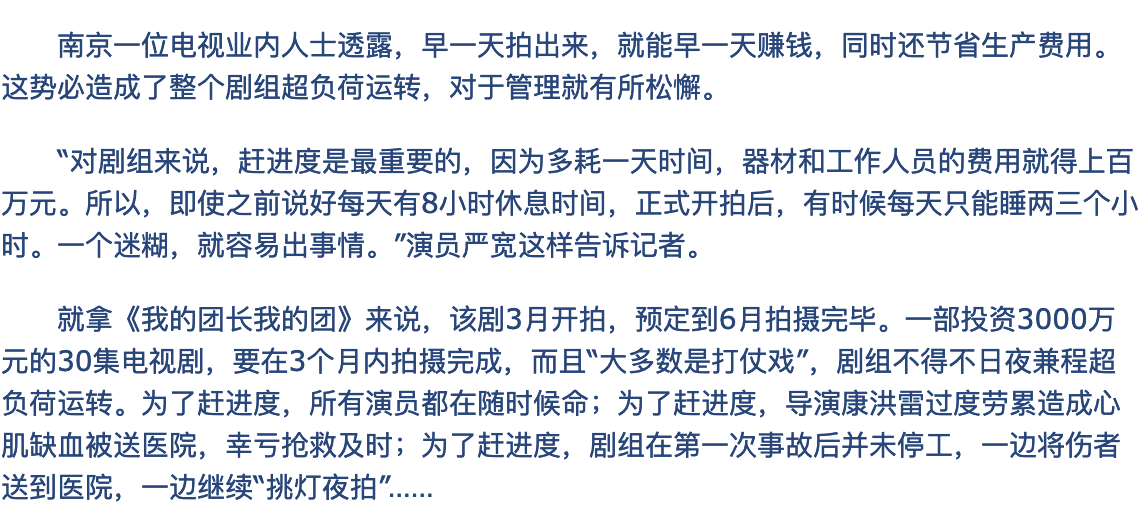 这名来自南京的电视业内人员称,剧组早一天拍摄完毕,就能早一天赚钱,同时还能够节省生产费用,这就很容易造成剧组超负荷运转,而在某些安全管理等细节上就很容易做不到位。
