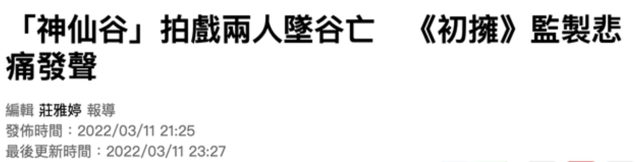 远的不提,演员炎亚纶拍摄的新剧《初拥》剧组,就发生过一起重大事故。在拍片现场,两名工作人员因不慎失足跌落溪谷,随后虽尽力抢救,但依旧不治身亡。这两名工作人员一个34岁,另一个38岁,都正值壮年。