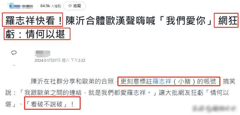 有趣的是,陈沂竟然在最近与欧弟有了合作。两人在拍摄合照时,陈沂配文写道:“我和欧弟之间的联结,就是我们都爱罗志祥。”这句话一出,立刻引起了轩然大波。人们纷纷猜测,这是否意味着欧弟和陈沂联手嘲讽罗志祥?而罗志祥又该如何应对这场突如其来的“攻击”?