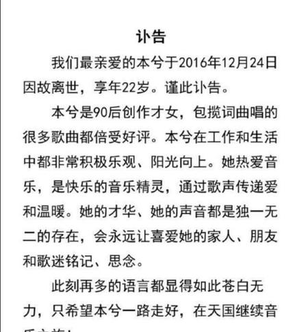 讣告里说:本兮在工作和生活中都非常积极乐观、阳光向上。她热爱音乐是快乐的音乐精灵。看到这样的词语是否想起了那个阳光大男孩——乔任梁,他和她在外界的眼里总是那样的乐观、阳光向上,但是他们真正的这样吗?他们或许只是把温暖给了别人,阴影总在黑夜里独自承受。乔任梁因抑郁症去世,我猜想本兮也有这样的可能。