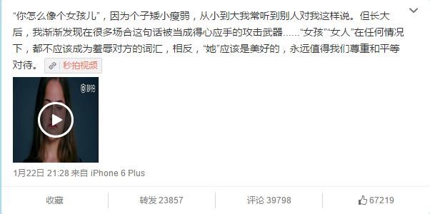 后郭敬明发微博称““你怎么像个女孩儿”,因为个子矮小瘦弱,从小到大我常听到别人对我这样说。但长大后,我渐渐发现在很多场合这句话被当成得心应手的攻击武器......“女孩”“女人”在任何情况下,都不应该成为羞辱对方的词汇,相反,“她”应该是美好的,永远值得我们尊重和平等对待。”