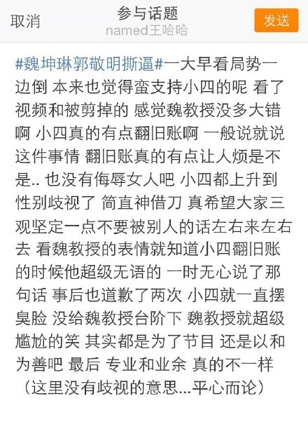 而挺魏坤琳的网友则表示:“他才应该道歉。他可以不赞同你的话,但是我希望他能认真听你说完,不是那一脸不屑的表情。这是最起码的尊重和教养。”