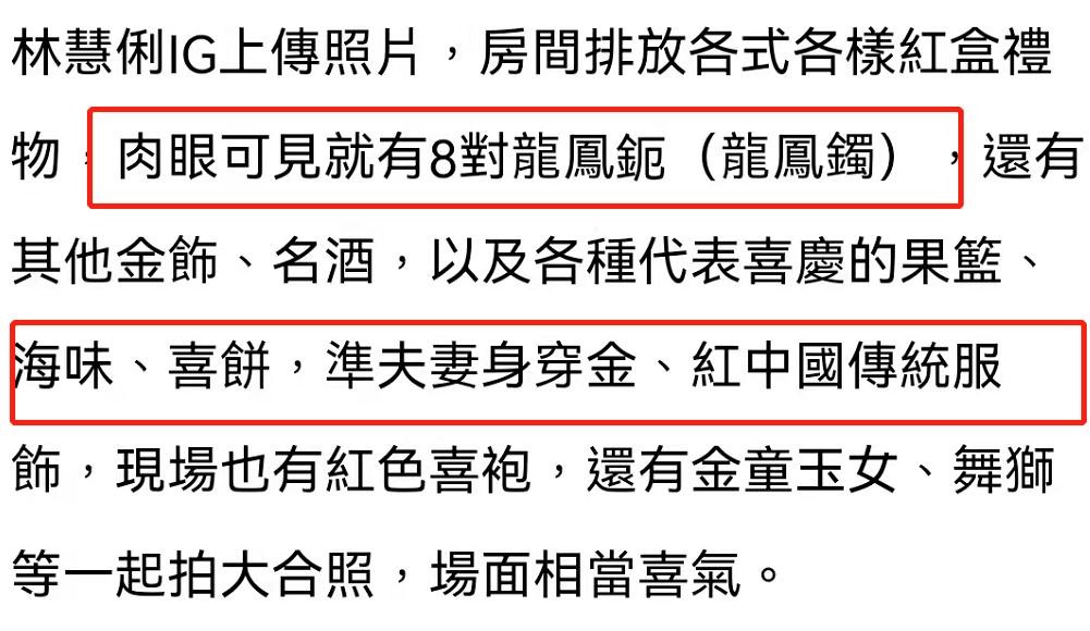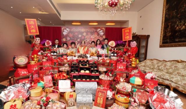 林慧俐在社交网站上晒出了16日过大礼仪式的近照,作为新加坡的百亿千金,林慧俐也是超有排面,各种礼物堆满了整个房间,还有各种红盒礼物,其中最显眼的就是画面中间的八队龙凤镯了,此外还有堆积如山的各种金饰、名酒、各种名贵的海产鲍鱼、花胶等等,看起来相当华丽奢靡,阵仗堪比当年赌王四房太太嫁女儿啊!