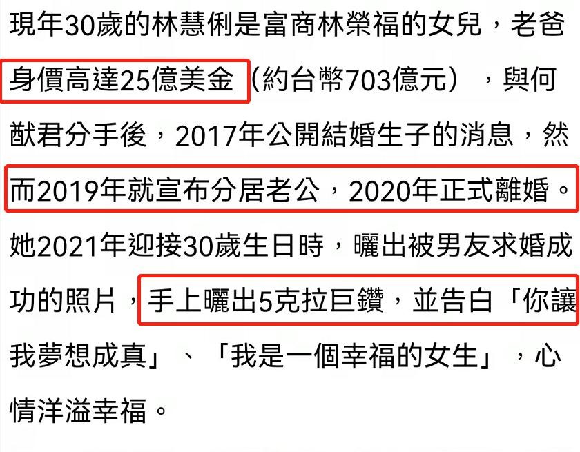 如今30岁的林慧俐是富商林荣福的女儿,因为老爸身价高达25亿美金(约合158亿人民币),因此林慧俐也被称为新加坡百亿千金,当年同赌王儿子何猷君恋爱时候,还曾被不少网友看好,只不过两人以分手告终,之后林慧俐在2017年公开了结婚生子的消息,但短短两年,在2019年却宣布与老公分居,直到前年离婚。