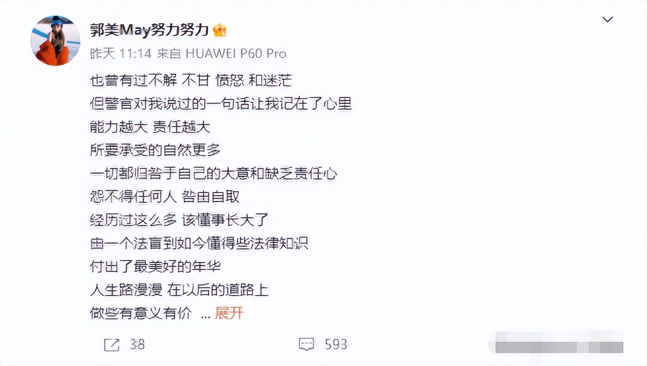 还记得之前郭美美刚出狱的时候就说,“在以后的道路上,做一些有意义有价值的事情,给中这个社会带来一些温暖……”