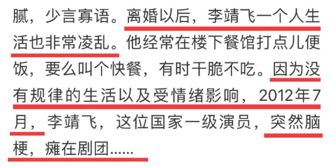 谁知,在2012年的时候,李靖飞由于情绪不佳和饮食不规律,突发脑梗,瘫在了剧团。